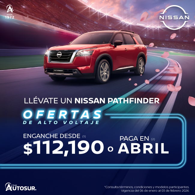 El importe corresponde al 10% de enganche en la versión PATHFINDER PLATINUM 4WD 25 sujeto a autorización de crédito por parte de CrediNissan. (2) Aplica para todas las versiones Pathfinder 2025 en operaciones de crédito celebradas con Credi Nissan. No aplica con otras promociones ni en compra de flotillas. Para conocer planes y modalidades de crédito, verificar precios, requisitos de contratación, comisiones, disponibilidad, términos y condiciones, consulta a tu Distribuidor Autorizado Nissan. Vigencia del 06 de enero al 03 de febrero 2026.